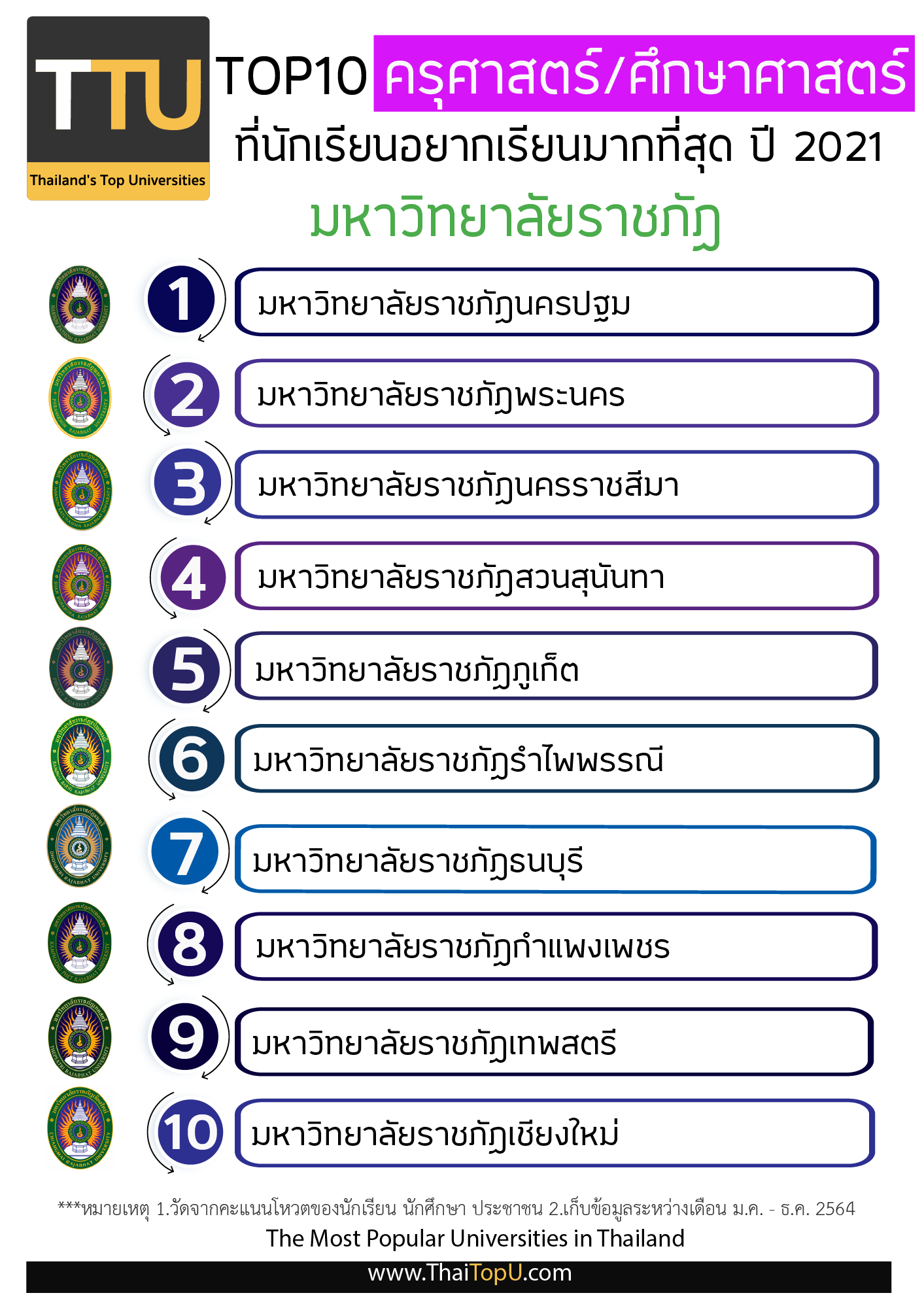 TOP 10 มหาวิทยาลัยไทย (ราชภัฏ) ยอดนิยมที่นักเรียนอยากเรียนมากที่สุด ปี 2021